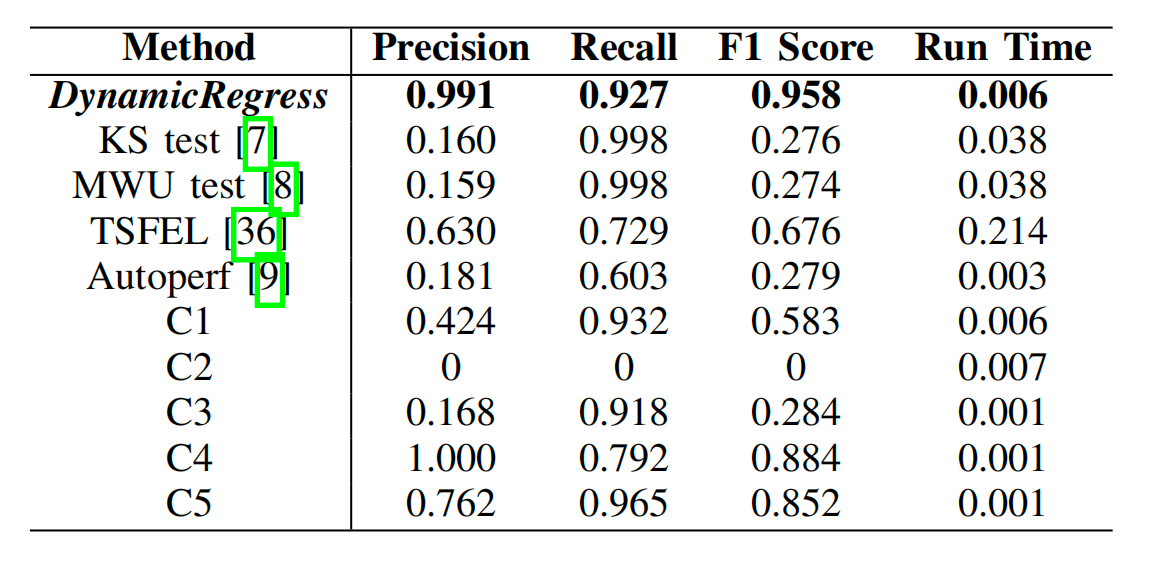 表1实验结果表明,DynamicRegress在各项指标上均显著优于基线方法:F1分数达到0.958,比最佳基线方法(TSFEL:0.676)提升0.282;精确度为0.991,召回率为0.927;检测时间为0.006秒每KPI对,满足工业实时检测要求(1s内判断出性能回归)。