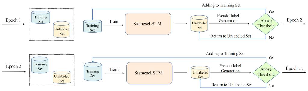 在离线训练阶段,首先通过数据预处理将多维度KPIs(响应时间、吞吐量、成功率)与工作负载(虚拟用户数Vusers)融合为多元时间序列输入,保留变长序列特性以适配动态负载场景,同时对稀缺的回归样本采用加噪和时间偏移的数据增强策略提升多样性;接着,将基线多维指标与周期执行的多维指标输入权重共享的SiameseLSTM网络,两个LSTM分支因共享权重参数,能以统一逻辑提取两类序列的时序特征并转化为固定维度的嵌入向量,再通过计算向量绝对差值与Softmax输出相似性概率,训练过程中采用加权交叉熵损失函数,以保证模型尽可能重点学习少数回归样本特征;同时,结合图3展示的半监督学习策略,利用初始训练好的模型对大量未标注数据生成伪标签,仅将预测置信度超阈值(0.07)的伪标签样本纳入训练集迭代扩展数据量,直至模型收敛。