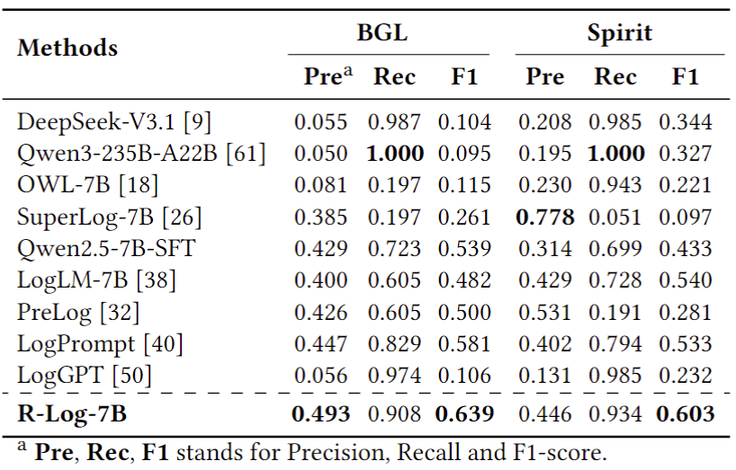 R-Log首先在一个由2000余条推理轨迹组成的精心构建的数据集上进行冷启动,这些轨迹由13 条源自人工运维实践的策略指导,以建立初步的推理能力。随后,该能力通过带联合奖励函数的RL得到进一步提升。基于真实日志的实证评估表明,R-Log在五项日志分析任务上均优于现有方法,尤其在未见过的场景中提升达到228.05%。我们还设计了R-Log-fast,其速度提升 5 倍,同时保留了 93% 的效果。