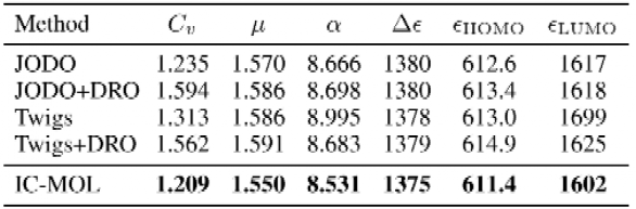 在QM9数据集上,针对六种量子属性(如热容、偶极矩等)模拟了两种分布偏移场景(从小值域到大值域S→L,以及从大值域到小值域L→S),并与JODO、Twigs等当前最先进的方法及其结合分布鲁棒优化(DRO)的变体进行了对比。在两种分布偏移场景下,IC-MOL在六种属性上都取得了最低的平均绝对误差,证明了其生成分子的属性更接近目标属性。