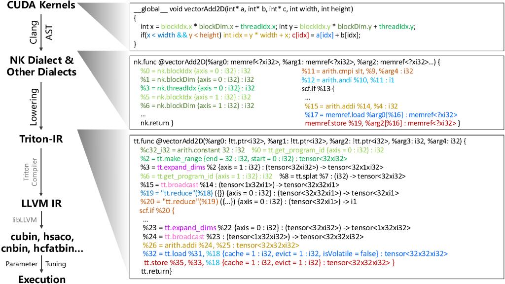 文章提出了名为CKTI的领域特定编译器,它通过将 CUDA 内核转换为与硬件无关的 Triton中间表示,解决了AI计算程序对特定厂商芯片的依赖问题。CKTI 利用线程模型调度算法、动态掩码映射等核心技术,成功实现了 CUDA 内核在 NVIDIA、AMD、昇腾、沐曦以及寒武纪等多种芯片上的跨平台部署。CKTI不仅实现了跨平台部署的通用性,更将性能可移植性作为其核心亮点。通过复用 Triton 和芯片自身的优化链路,CKTI能够充分挖掘不同硬件的计算潜力。实验结果表明,CKTI在多个平台上均实现了卓越的性能加速,在 NVIDIA 平台上达到 1.28 倍加速,在AMD平台上为1.17倍,在沐曦平台上为 1.14 倍,并成功解锁了在寒武纪平台上的部署,同时能够与芯片自身软件栈(如昇腾CANN)共同完成端到端模型任务,有效推动了计算生态的多样化发展。