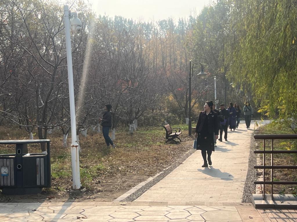 走进津北森林公园,老师们立刻被富有诗意的景色吸引住了,厚厚的落叶为公园铺上了金黄的地毯,林间的小径蜿蜒着伸向远方,大家漫步其间,或驻足拍照,或嬉戏聊天,尽情享受大自然的惬意,欢声笑语回荡在树林间。