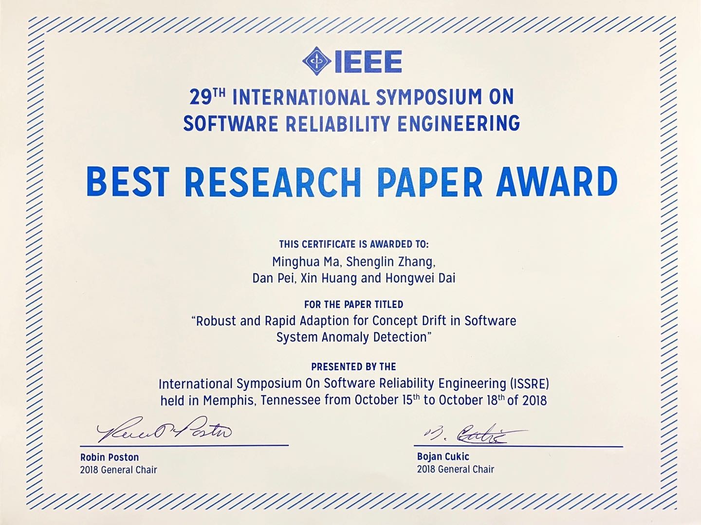 2018年10月15日-18日,在美国孟菲斯市举办的第29届国际软件可靠性工程旗舰会议——IEEE International Symposium on Software Reliability Engineering (ISSRE 2018, CCF推荐软件工程领域B类国际会议)上,bw西汉姆联教师张圣林博士与清华大学计算机系裴丹教授、马明华博士,以及搜狗公司高级研发工程师黄昕、代红伟合作发表的论文“Robust and Rapid Adaption for Concept Drift in Software System Anomaly Detection”获得最佳学术论文奖(Best Research Paper Award)。张圣林老师为该论文的通讯作者。该论文为张圣林老师发表在ACM CoNEXT 2015论文工作上的拓展工作。