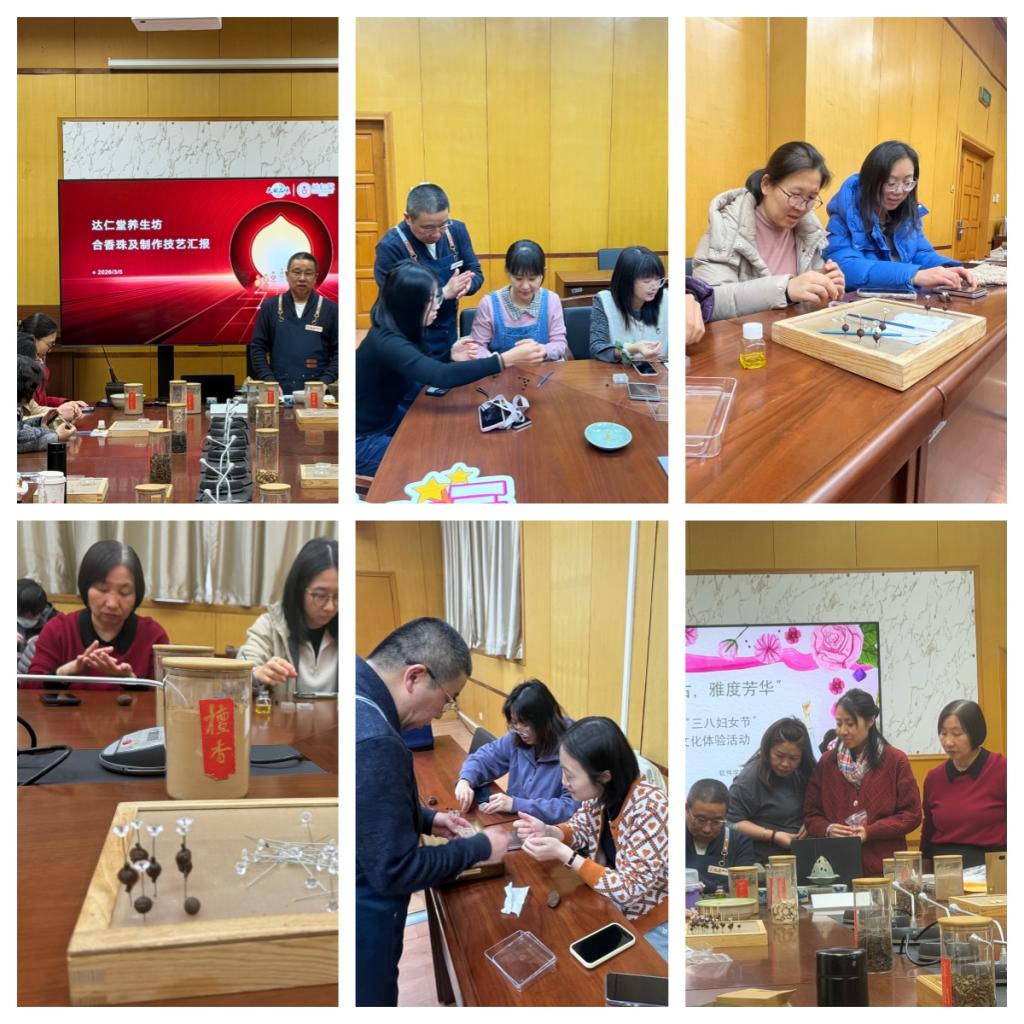 付军先生从香的历史渊源、文化内涵讲起,详细介绍了制香的原料、工艺与礼仪,并现场演示了合香珠的制作过程。在老师的指导下,教职工们亲手研磨香料、搓制香珠、穿缀手串,指尖流转间,将沉香、檀香等天然香料的芬芳凝于方寸之间。大家专注投入,在一揉一搓中感受非遗技艺的精妙,在一呼一吸间品味传统文化的雅致。