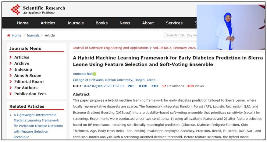(通讯员 楚义芳)近日,美国科研出版社旗下的《软件工程与应用》学术期刊(Journal of Software Engineering and ApplicationsVol.19 No.2, February 2026,Scientific Research Publishing Inc.),在2026年第2期,发表了2024级商务部援外班塞拉利昂职工阿米纳塔(Aminata Bah)的学术论文《塞拉利昂早期糖尿病预测的混合机器学习模型》(Hybrid Machine Learning Model for Early Diabetes Prediction in Sierra Leone),该论文实际是阿米纳塔正在撰写的硕士学位论文的研究摘要。