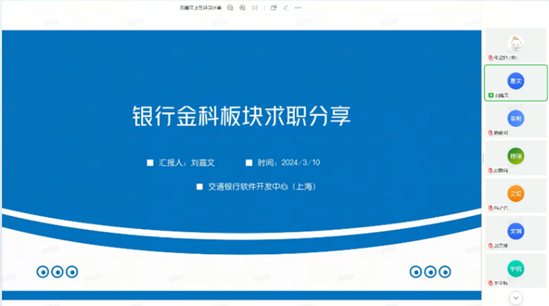 就业经验分享活动于3月10日开展,邀请了三位在各自领域取得优异成绩的员工,在互联网领域工作的两位员工分享了简历准备、求职技巧、笔试面试准备以及职场心态等方面的实用建议。就职于银行金融科技领域的员工,详细解析了该行业的求职要求、发展前景和应聘技巧,为有意向进入该领域的员工提供了宝贵的指导。