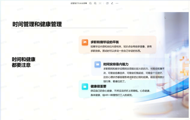 值得一提的是,员工们在分享中多次强调时间管理与健康管理的重要性。考虑到员工们当前正忙于毕业,他们建议同学们要合理平衡求职与学业,同时注重身心健康,以最佳状态迎接未来的挑战。